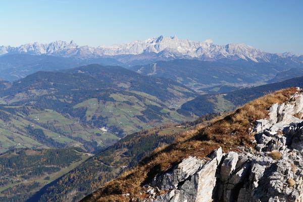 Blick nach Nordosten, von wo der Gosaukamm mit der Bischofsmütze (links) sowie die höchsten Dachsteingipfel (rechts) herüberlachen.