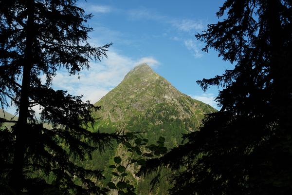 Weiter oben im Wald schlängelt sich der nun etwas bessere Weg kühn am Fuße senkrechter Felswände vorbei. Von der anderen Talseite lacht das Karnereck herüber.