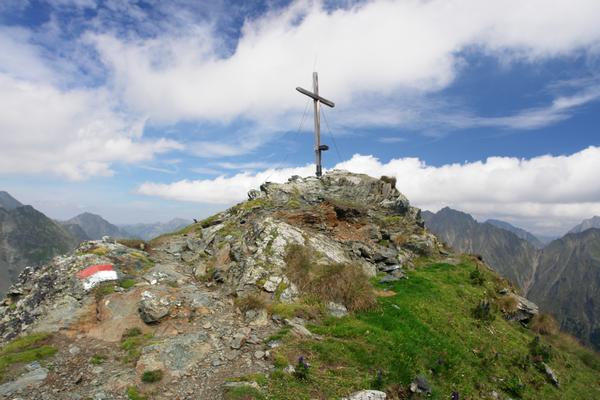 Beim Gipfelkreuz der Zechnerkarspitze erreichen wir markiertes und einfacheres Gelände.