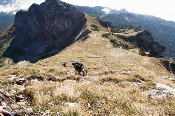 Die obersten, zunehmend aufsteilenden Wiesenhänge sind teilweise durch Drahtseile und Trittklammern entschärft.