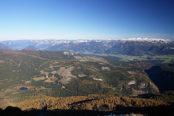 | Die Ausblicke - gewohnt eindrucksvoll: Nach Norden über das steirische Salzkammergut in das teils schneebedeckte Tote Gebirge. Links unten der Miesbodensee, an dem wir bei unserem Abstieg vorbeikommen werden. |
