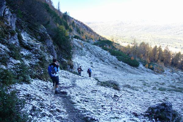 | Während der Aufstieg bis knapp unter den Gipfel weitgehend angenehm warm war, wurde es durch den Wind im Gipfelbereich ganz schön kühl. Aber auch beim Abstieg über die schattige Nordseite kam keine richtige Wärme auf. Der Weg ist ob seiner Rutschigkeit nicht zu unterschätzen. |