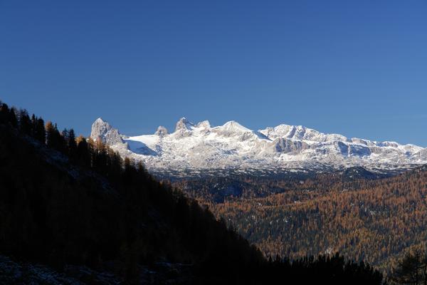 | Auch von hier beste Ausblicke zu den höchsten Dachstein-Gipfeln. Ganz links der Gr. Koppenkarstein. In Bildmitte der Hohe Dachstein. Weiter rechts die Gjaidstein-Kette. |