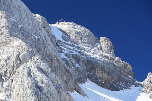 Einige unerschrockene Kletterer steigen von der Randkluft zum Gipfelkreuz am Hohen Dachstein auf.