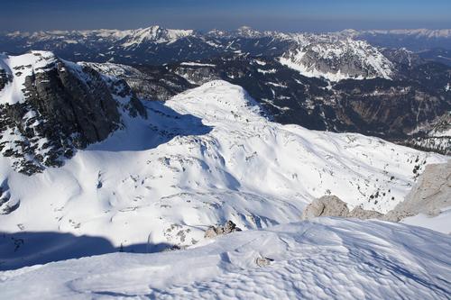 Ausblick nach Norden über den schneebedeckten Gamskogel (?) zum Plassen und zu den Salzkammergutbergen.