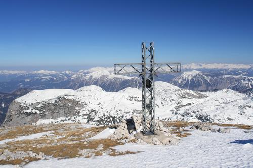 ... von welchem man schöne Tiefblicke über das nördliche Dachsteinplateau mit dem Wiesberghaus hinweg in das westliche Tote Gebirge hat.