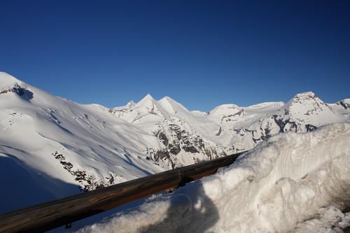 | Schließlich brachten uns 2 Kleinbusse mit etwa 20 weiteren Schitourenhungrigen über die Glocknerstraße zum Fuscher-Törl. Tiefster Winter - ja, aber nur neben der meist aperen Straße. |