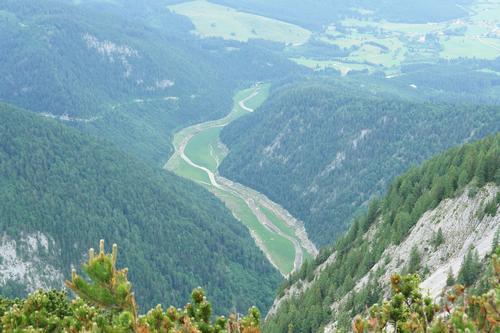 | Tiefblick zum derzeit trockengelegten Salza-Stausee, der sich heuer in ungewohntem grünen Kleid präsentiert, da an der Staumauer derzeit gerade Reparaturen durchgeführt werden. |