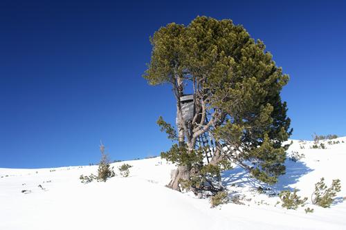 Vorbei am letzten Baum, in dessen Geäst sich mehr oder weniger gut getarnt ein Hochsitz verbirgt.