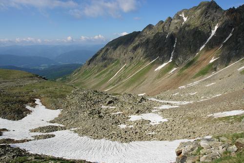 | Blick vom Mühlbachtörl zurück über das Aufstiegsgelände im Preberkessel. Rechts die Golzhöhe, welche ich am Nachmittag besuchen werde. |