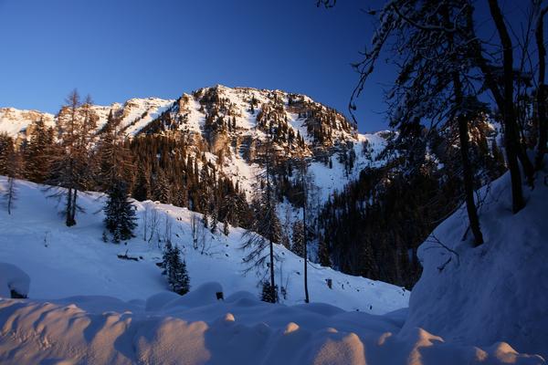 | Bis zur Langpoltenalm gestaltet sich der Weg äußerst einfach und lawinensicher. Eigentlich die einzige Schlüsselstelle wartet im Steilstück von der Langpoltenalm hinauf zum Hochtor. Im Bild erkennt man den Steilhang rechts der Bildmitte. Im Bild sieht es aber schwieriger aus, als es dann vor Ort wirklich ist - Lawinenrutsche habe ich aber in diesem Abschnitt schon einige beobachtet. |