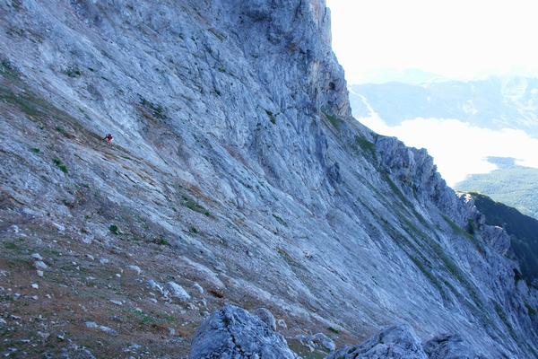 | Immer wieder nimmt man die Hände zur Hilfe, um auf den vielen Steinchen auf den Felsplatten das Gleichgewicht zu halten (Ingrid im linken, oberen Bildbereich). |