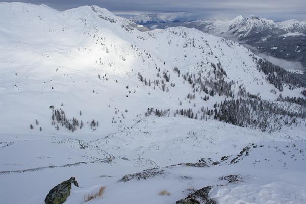 Der Tiefblick ins Gnadenkar zeigt uns eine Abfahrts- bzw. Abstiegsvariante, die wir bei besseren Wetterverhältnissen unbedingt einmal versuchen wollen.