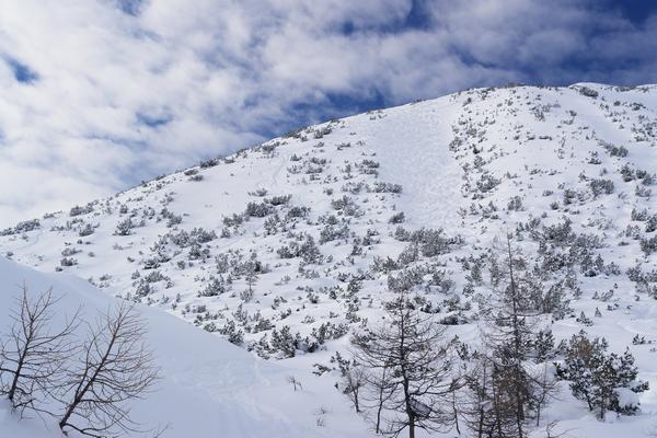Während die Schifahrer die relativ latschenfreie Rinne rechts der Bildmitte wählten, sind wir links davon abgestiegen. Bei genauerem Hinsehen erkennt man Ingrid´s "Bobbahn".