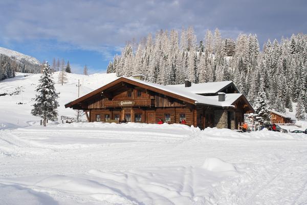 Karl ist mit den Schiern vorausgefahren und hat sich bereits einen Kaffee bei der Vordergnadenalm schmecken lassen.