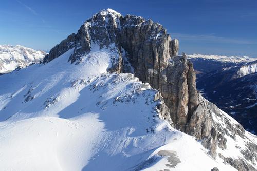 | Ingrid und Karl (als winzigste Punkte) befinden sich bereits oberhalb der Bildmitte beim Abfellen. Ich habe (vermeintlich) den Objektivdeckel meines Fotoapparates am Gipfel vergessen. Also noch einmal Aufstieg, um dort festzustellen, daß sich der Objektivdeckel im Hosensack befindet. Gerüchte, wonach ich das absichtlich gemacht hätte, um noch einige Höhenmeter zu machen, entsprechen nicht der Wahrheit ;-) Unsere Abfahrt führt uns über den Steilhang am Fuße der Felswände und weiter über das Gasthofkar zur Schliererscharte und bei noch brauchbaren Firn über das obere Urbankar. Unterhalb von 1.850 Meter Höhe bis zur Muhreralm sehr weiche Schneedecke mit Einsinktiefen bis über die Knie. |