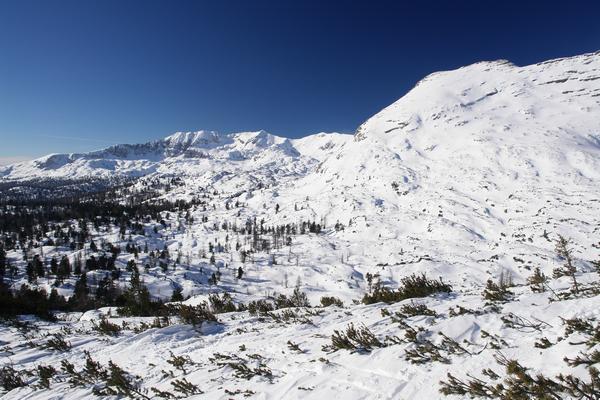 Blick südlich am Roßarsch vorbei Richtung Westen zu Hochmölbing und Schrocken. Um den Roßarsch herum die Schitour zum Pyhrner Kampl (Siehe Schitour vom 19.03.2006).