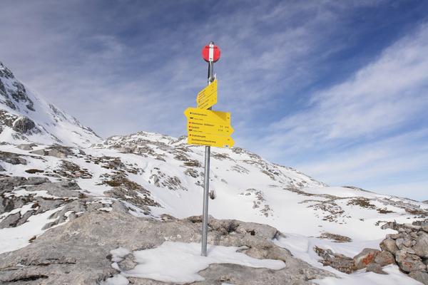 Bei der Feisterscharte gelangt man zu einigen Wegweisern, die verschiedene Wanderziele in allen Richtungen anzeigen.