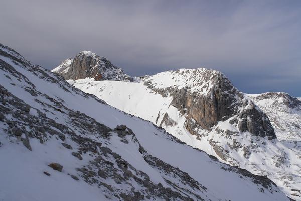 | Ab der Mittagszeit hat es jetzt ziemlich zugezogen. Nur gelegentlich können einige Sonnenstrahlen durch die Wolkendecke dringen, um die umliegenden Gipfel zu erhellen. Links der Große Koppenkarstein. Rechts der benachbarte Landfriedstein. Rechts im Hintergrund der Gebirgszug im Umfeld der Gjaidsteine. |