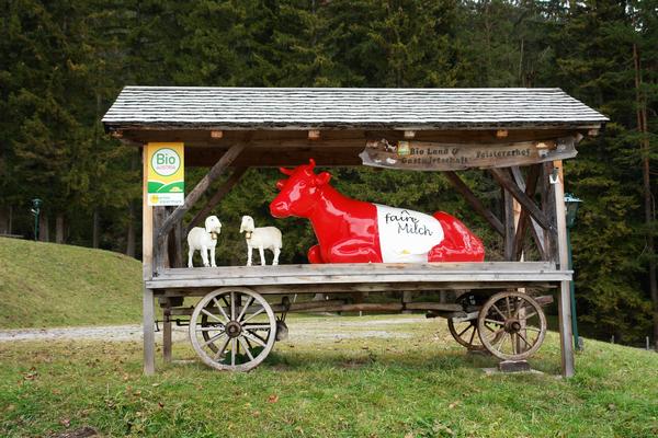 ... gelange ich wieder zurück zum Gasthof Feisterer, in dessen Umfeld sich einige Tiere (Hund, Esel, Pferd, Schafe) tummeln. Und auch welche nicht aus Fleisch und Blut.