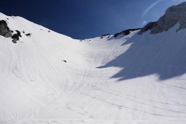 Blick von weiter unten über den steilsten Abschnitt des Angerkars, in dem sich links und rechts oberhalb der Bildmitte im obersten Karbereich gerade - winzig klein - 6 Schitourengeher befinden.