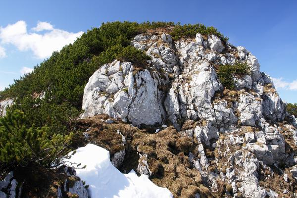 Schließlich hatte ich den lästigen Latschengürtel überwunden. Auf den letzten Höhenmetern wartete noch ein kurzer Felsaufschwung mit sehr brüchigem Gestein.