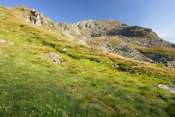 | Beim Aufstieg vom Lignitzsee in die Weite Scharte - südlich des Graunock - kommen aber auch wir in den Genuß der wärmenden Sonne. Über den Südgrat im linken Bildbereich werden wir später zum Gipfel des Graunock aufsteigen. Über den Rücken auf der rechten Seite werden wir am Nachmittag wieder herunter kommen. |