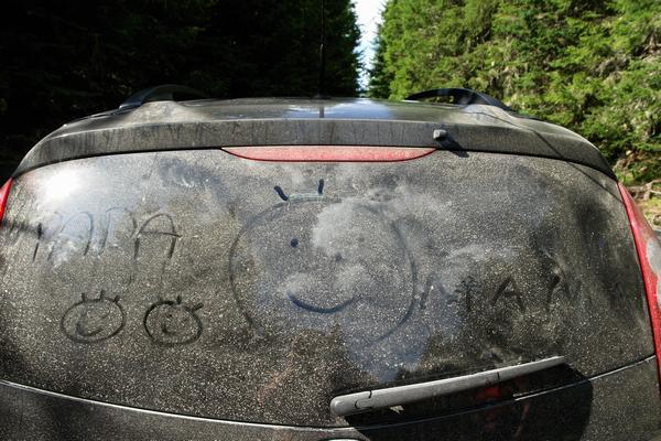 | ... wo unser Auto durch die vorbeifahrenden Fahrzeuge mittlerweile ordentlich eingestaubt wurde - vorher war es natürlich auf Hochglanz poliert ;-). Aber so hatten wenigstens einige Kinder ihre Freude, als sie sich auf meiner Scheibe bemerkbar machen konnten. |