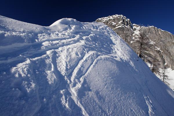 | Der schmale Grat war von ihren Schiern abgefahren. Dadurch hatte ich nun auch mit den Harschkrallen meiner Schneeschuhe besseren Halt und in kleinen, äußerst konzentrierten Schritten kam ich wohlbehalten über den ausgesetzten Grat hinweg. Etwas weiter unten auf einem Steilhang habe ich die Schneeschuhe dann abgeschnallt und bin einfach mit den Wanderschuhen - teilweise tief versinkend - den Hang runter. |