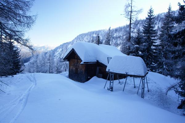 | Sicher und wohlbehalten (nur ein einziges "Stürzchen", weil ich mit den Schneeschuhen im Bruchharsch stecken geblieben bin, der Kopf aber im Schwung zu tallastig war) erreichte ich die Hütten im Bereich der Quehenbergalm. |