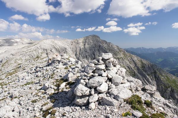 | Am Anstieg zum Gipfelstoamandl am Hochplanberg weiche ich einige Höhenmeter in die schottrige, gestufte und ausgesetzte Westflanke aus. Beim Rückweg wähle ich den Grat, der nur an einer kurzen Stelle die Unterstützung der Hände erfordert und ansonsten gut begehbar ist. |