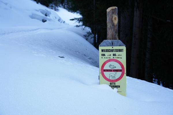 | Die untersten 500 Höhenmeter führen entlang der Sommermarkierung durch den mitunter steileren Wald - mehrmals Forstwege querend. Die stellenweise magere Schneedecke ist für Schitourengeher nicht mehr optimal. Diese könnten aber über die mittels Schidoo präparierte Forststraße ausweichen. Im obersten Bereich gilt es aber das Wildschutzgebiet zu beachten. |