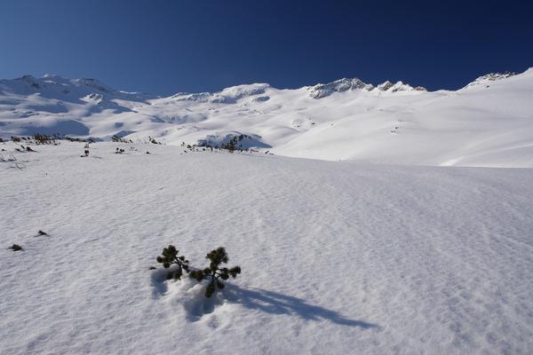 Bei einer Höhe von knapp 2.000 Meter erreicht ich die Baumgrenze und der Ausblick über das große Gstößkar wird frei bis zum Keeskogel (in Bildmitte), dem man die fast 1.000 Meter größere Höhe von hier aber nicht ansieht.