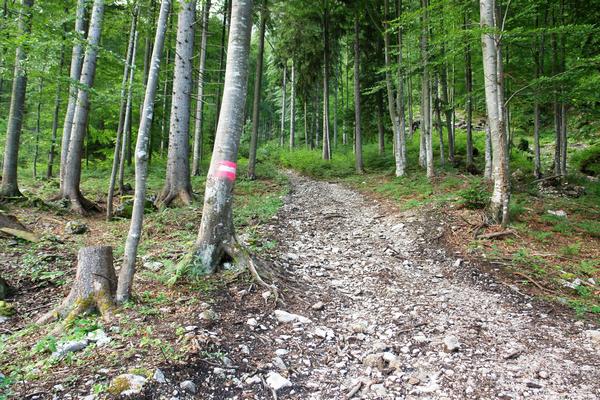 Zunächst noch über die Forststraße, bald aber in einen Waldsteig abzweigend - anfangs noch breiter ...