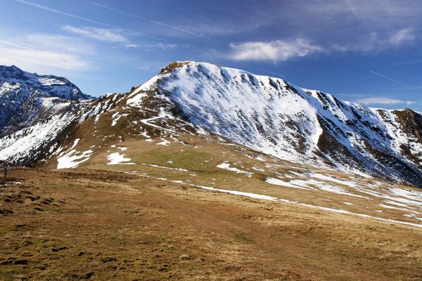 Blick zurück zum Pleschnitzzinken. Aufgestiegen sind wir über die rechte Bildseite. Herabgekommen sind wir über den weitgehend aperen Rücken im linken Bildbereich.