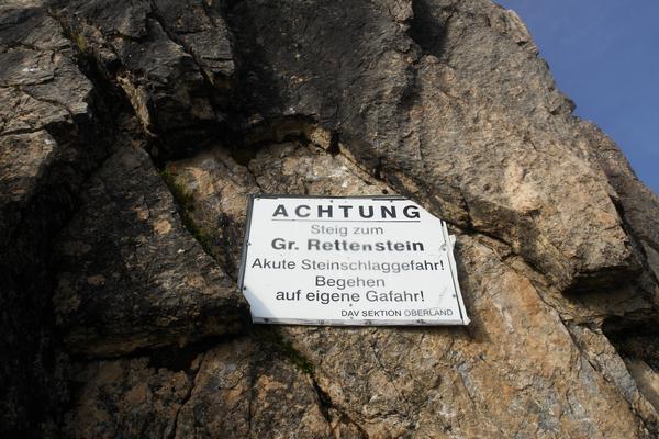 | Einige Warnschilder weisen auf die Steinschlaggefahr hin, die - hier auf Tiroler Landesgebiet - als "GAFAHR" bezeichnet wird. Abgesehen von der Rechtschreibung konnten wir keine nennenswerten Unterschiede zum Hauptteil von Österreich (Steiermark und Salzburg) festellen ;-) |