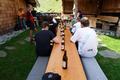Über diesen - stellenweise zwar etwas steileren, aber einfach und unschwierig begehbaren - Almweg gelangten wir wieder zurück in unser Basislager, von dem bereits unter der Federführung des großen Chefkochs Steff köstlichste Grilldüfte herauf wehten. Und diese Düfte waren nur ein Vorgeschmack auf die herrlichsten Speisen, die uns heute noch kredenzt werden sollten. Zuallererst aber mußten wir - selbstverständlich nur aus medizinischen Gründen - unseren Körpern die zuvor ausgeschwitzten, aber lebensnotwendigen Salze, Mineralstoffe und andere Nährstoffe wieder zuführen. Optimal vom Quellwasser temperiert, ließ sich das dem Reinheitsgebot folgende Naturgesöff vorzüglich genießen. Zu vorzüglich. Denn allzu oft wurde der Gang in das romantische Aber lassen wir das. Widmen wir uns wieder der Schönheit der Alm und unserer Feier.