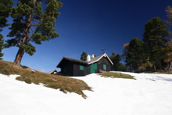 Sogar Schneeschuhe sahen wir bei einer Hütte nahe dem Steinerhaus lehnen. Ein sonnenhungriger Wanderer machte es sich liegenderweise auf einer Bank vor der Hütte gemütlich.