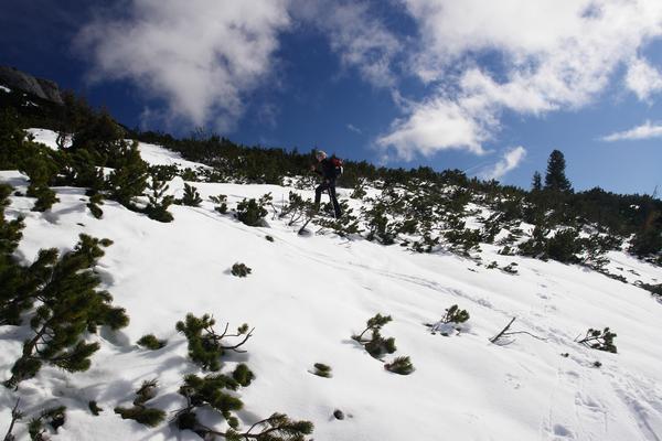Zwischen Latschen hindurch folgten wir einer einsamen Schispur.