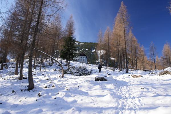 Zunächst folgen wir aber den Fußspuren im Schnee hinauf zur nahen Dümlerhütte.