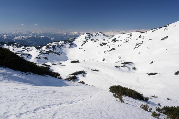 Blick hinab in das Tourengelände über welches ich am Nachmittag durch die Nirneckgrube auf den Hundskogel aufsteigen werde.