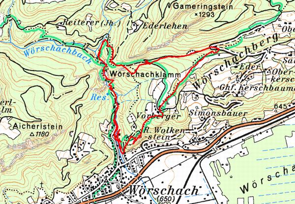Der Routenverlauf - entgegen dem Uhrzeigersinn: Start von Wörschach beim Parkplatz Wörschachklamm. Nach einigen "Verirrungen" Aufstieg zur Burgruine Wolkenstein. Danach weiter über den Berghof Vorberger und in einem ausschweifenden (eckigen) Bogen in die Wörschachklamm. Abstieg zurück zum Ausgangspunkt.