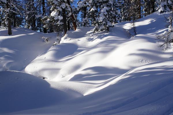Im hügeligen Wald gibt es einige Flachstücke, die bei vorausschauender Spuranlage aber mit etwas Schwung fast durchwegs befahren werden können.