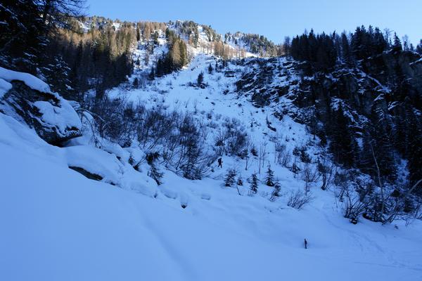 Wieder zurück über die Steilstufe, bei der einige kleinere Lawinenkegel das Überschreiten der Forststraße erschwerten.