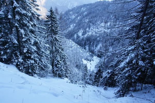 Immer höher bringen mich die Kehren des einfach begehbaren Forstweges im Wald. Tief unter mir der Gofergraben.