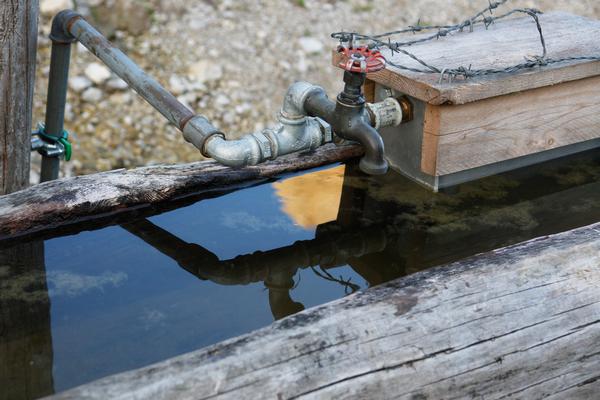Auffüllen der Wasservorräte bei der Oberen Jochalm für den langen Forststraßenabstieg.
