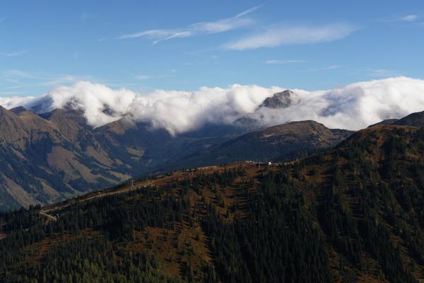 Trotz des kühlen Windes habe ich heute großes Glück mit dem Wetter. Denn weiter südlich und östlich drängen dichte Wolken gegen den zentralen Hauptkamm der Niederen Tauern. Im Vordergrund erkennt man das Schigebiet der Riesneralm.