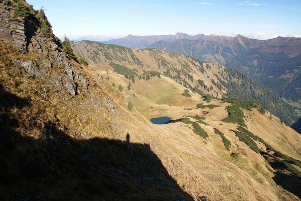 ... ein kleiner See im Steinkar. Mindestens 1 Hirsch - dem Klang nach ein äußerst kapitaler - deckt das Kar mit seinem brunftigen "Gruntzen" ein.