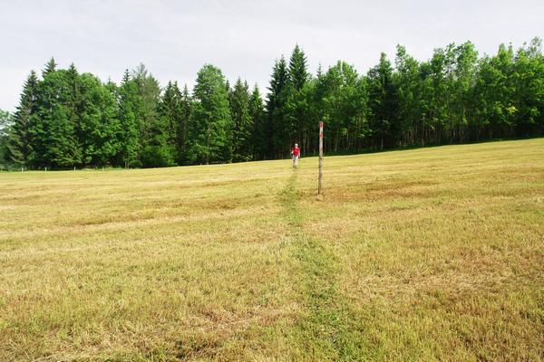 ... eine gerade frisch gejauchnete und bei der Hitze dementsprechend intensiv "duftende" Wiese, die wie zu queren hatten, um gleich darauf auf unseren Anstiegsweg vom frühen Morgen zu treffen.