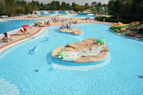 Neben einem großen Schwimmbecken, wo sportliche Erwachsene ihre Runden bzw. Längen ziehen, gibt es auch für die kleineren Besucher noch allerlei andere Planschmöglichkeiten, welche sowohl bei Tag ...